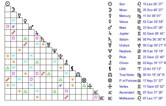 | Moon | 25 Scorpio 41 | 8 Aquarius 41 | 16 Aries 10 |