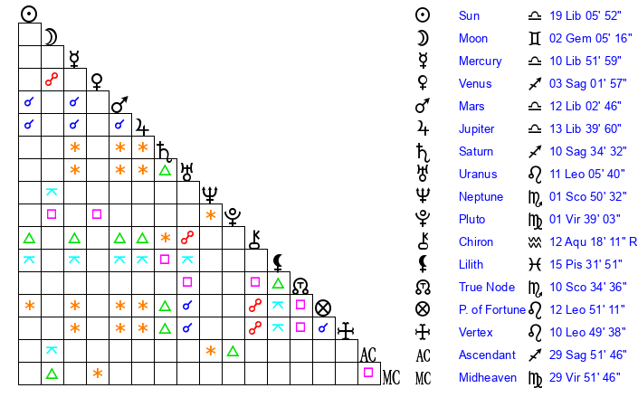 | Sun | 19 Libra 6 | 19 Libra 37 | 27 Sagittarius 32 |