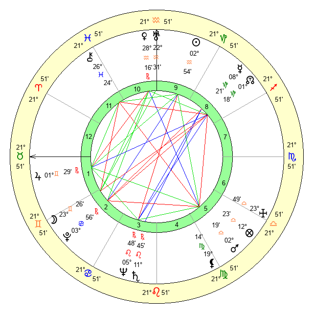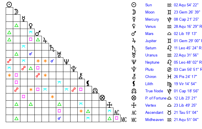 | Moon | 23 Gemini 24 | 24 Scorpio 1 | 21 Taurus 28 |