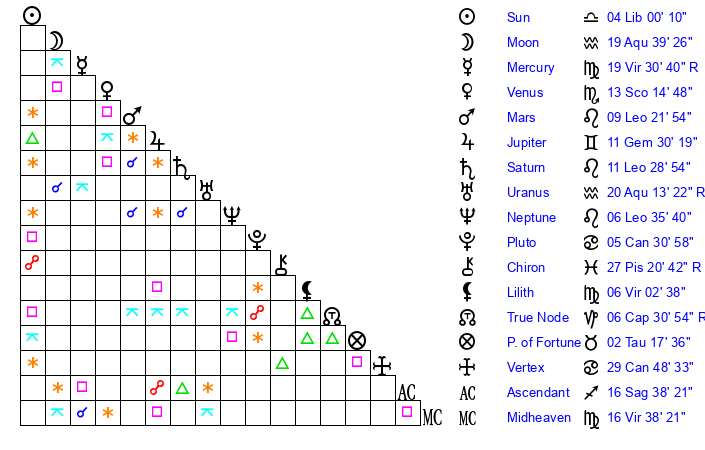 | Sun | 4 Libra 0 | 4 Libra 50 | 22 Capricorn 43 |