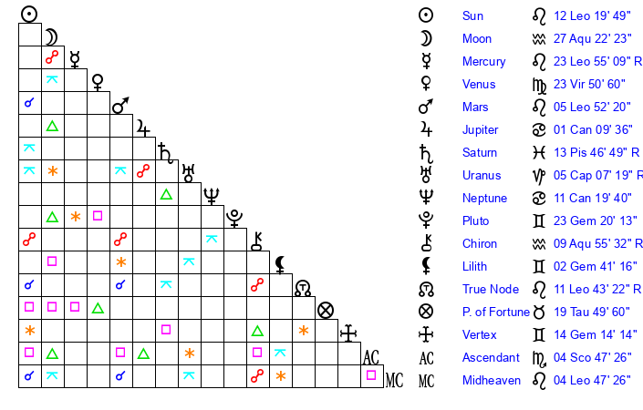 | Moon | 27 Aquarius 19 | 29 Sagittarius 56 | 28 Gemini 33 |