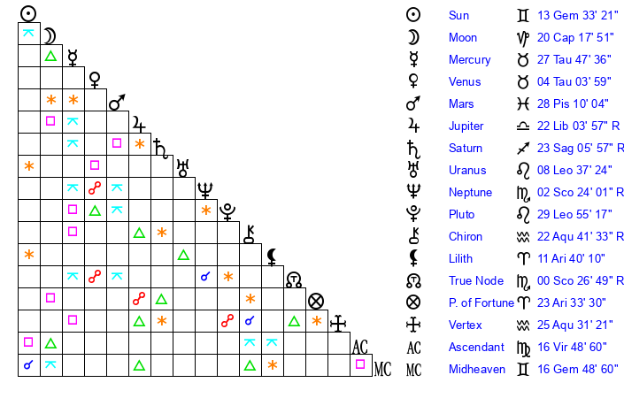 | Moon | 20 Capricorn 20 | 1 Libra 44 | 21 Gemini 2 |