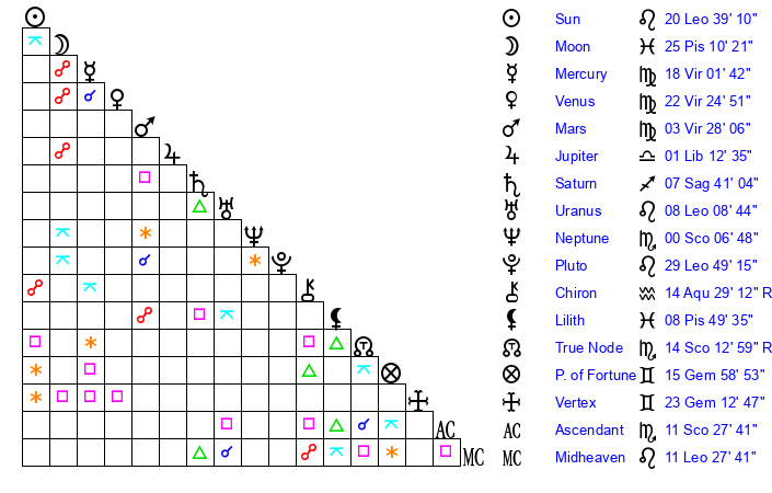 | Moon | 25 Pisces 12 | 17 Aries 50 | 22 Virgo 31 |