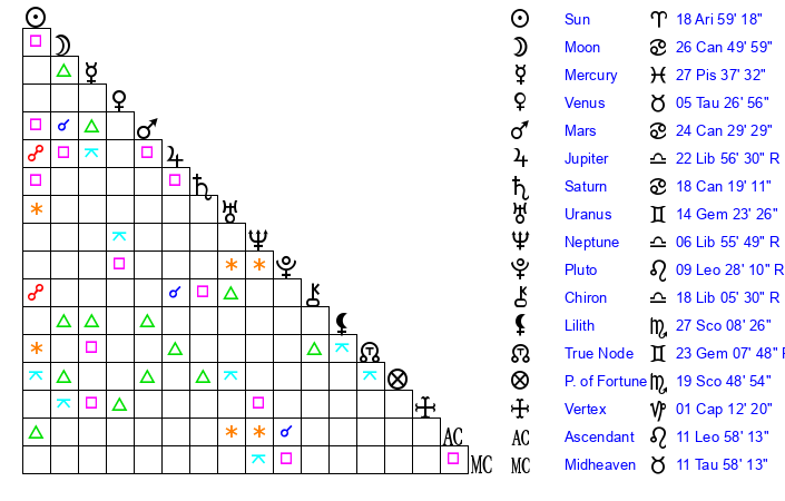 Sun | 19 Aries 0 | 19 Aries 51 | 5 Cancer 11 |