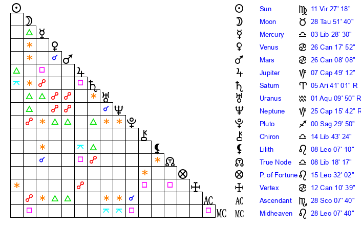 Sun | 11 Virgo 27 | 11 Virgo 27 | 9 Libra 46 |