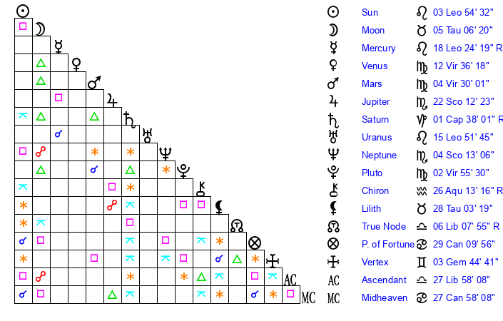 | Moon | 5 Taurus 8 | 10 Virgo 48 | 26 Virgo 56 |