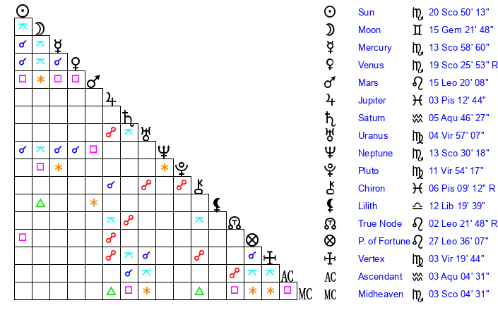 | Sun | 20 Scorpio 50 | 21 Scorpio 34 | 24 Capricorn 50 |