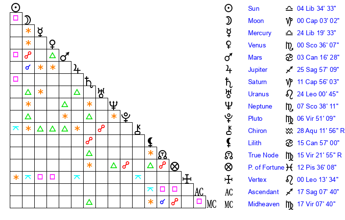 | Sun | 4 Libra 35 | 4 Libra 50 | 9 Sagittarius 31 |