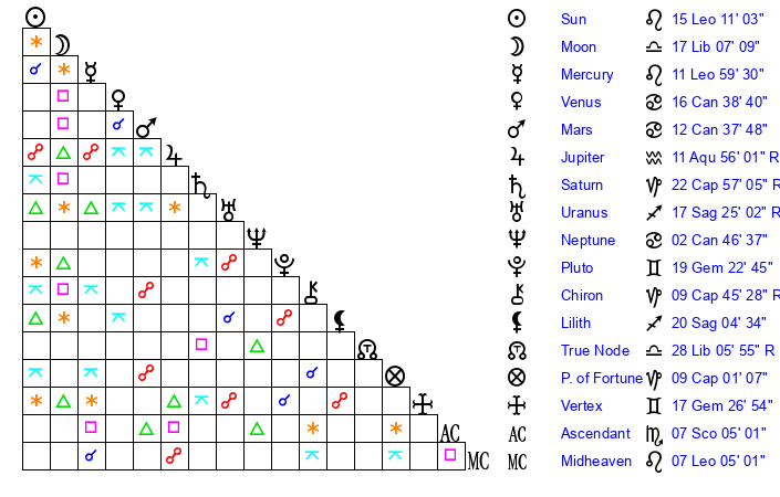 | Mercury | 12 Leo 0 | 4 Leo 37 | 15 Sagittarius 9 |