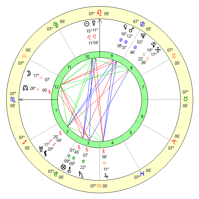 | Moon | 17 Libra 16 | 8 Aquarius 41 | 3 Aries 51 |