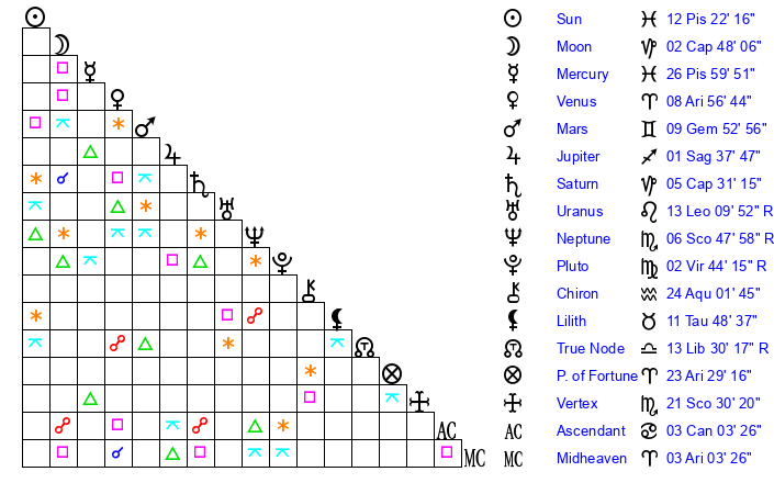 | Sun | 12 Pisces 22 | 13 Pisces 22 | 17 Taurus 21 |