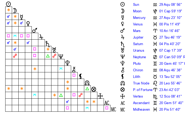 | Sun | 29 Aquarius 9 | 0 Pisces 17 | 25 Gemini 34 |