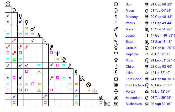 | Venus | 17 Capricorn 50 | 9 Pisces 53 | 16 Aries 39 |