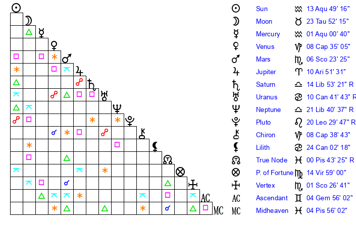 | Sun | 13 Aquarius 49 | 15 Aquarius 7 | 26 Aries 38 |