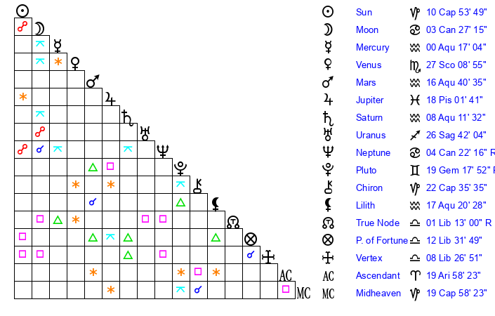 | Sun | 10 Capricorn 54 | 12 Capricorn 18 | 12 Taurus 48 |