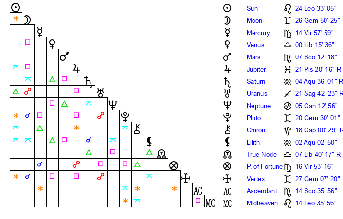 | Sun | 24 Leo 33 | 26 Leo 0 | 25 Sagittarius 37 |