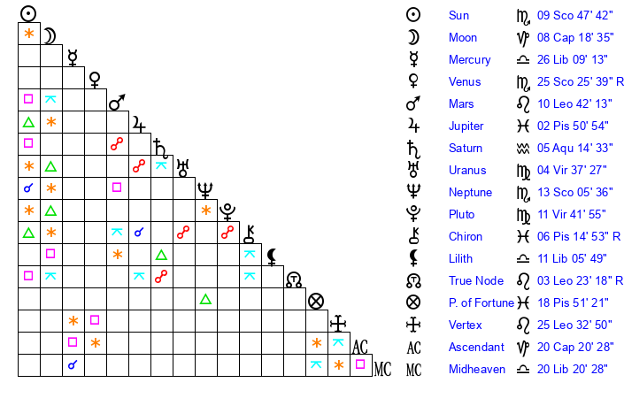 | Sun | 9 Scorpio 48 | 10 Scorpio 31 | 13 Capricorn 37 |