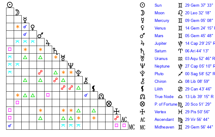 Moon | 20 Leo 32 | 24 Aries 37 | 11 Virgo 19 |