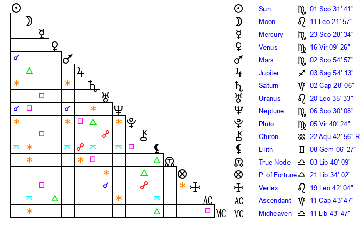 | Moon | 11 Leo 18 | 18 Sagittarius 11 | 21 Capricorn 5 |