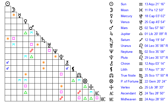 | Venus | 25 Capricorn 46 | 28 Pisces 35 | 20 Aries 29 |