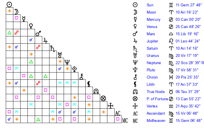 | Moon | 10 Aries 15 | 7 Virgo 26 | 19 Taurus 51 |