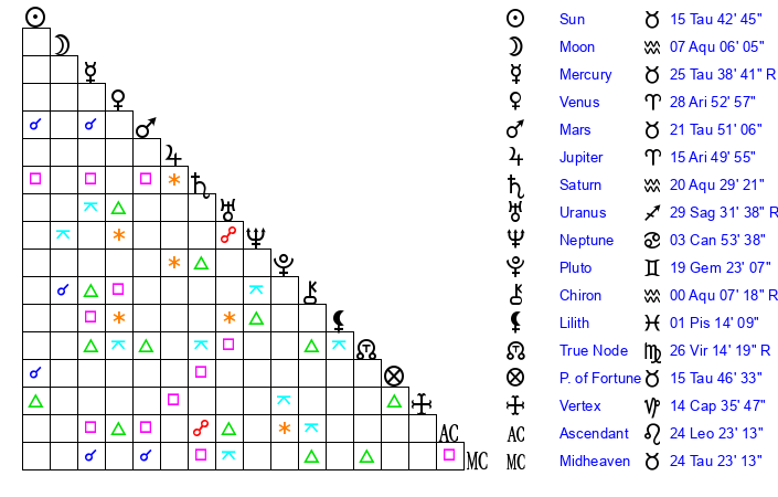 | Pluto | 19 Gemini 24 | 3 Aquarius 48 | 21 Gemini 41 |