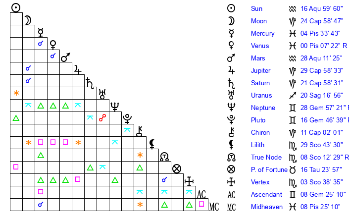 | Pluto | 16 Gemini 47 | 2 Aquarius 14 | 18 Gemini 10 |