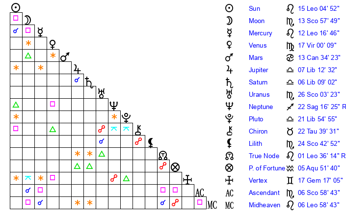 | Moon | 14 Scorpio 5 | 25 Capricorn 29 | 25 Gemini 57 |