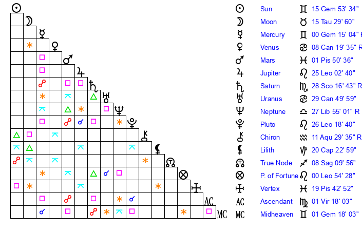 | Sun | 15 Gemini 53 | 16 Gemini 12 | 21 Leo 48 |