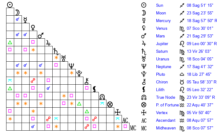 Moon | 23 Sagittarius 13 | 11 Sagittarius 30 | 29 Leo 24 |