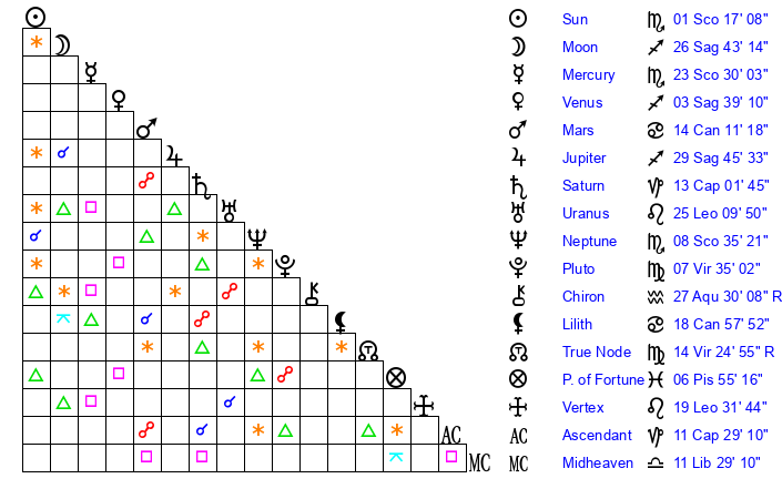 | Sun | 1 Scorpio 17 | 1 Scorpio 32 | 6 Capricorn 59 |