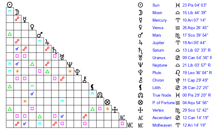 | Neptune | 21 Libra 3 | 29 Pisces 22 | 19 Libra 15 |