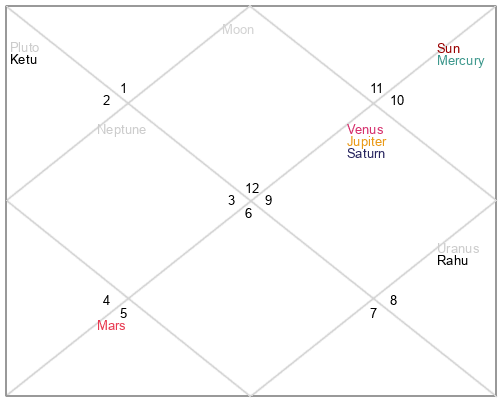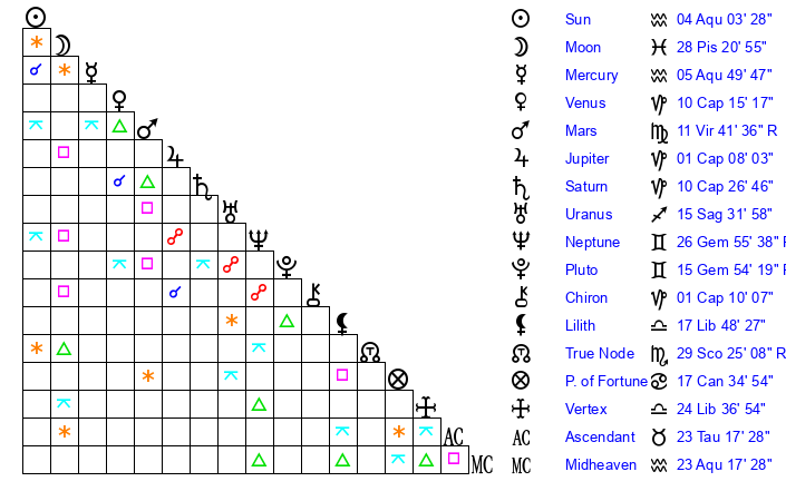 | Sun | 4 Aquarius 3 | 4 Aquarius 58 | 6 Gemini 38 |