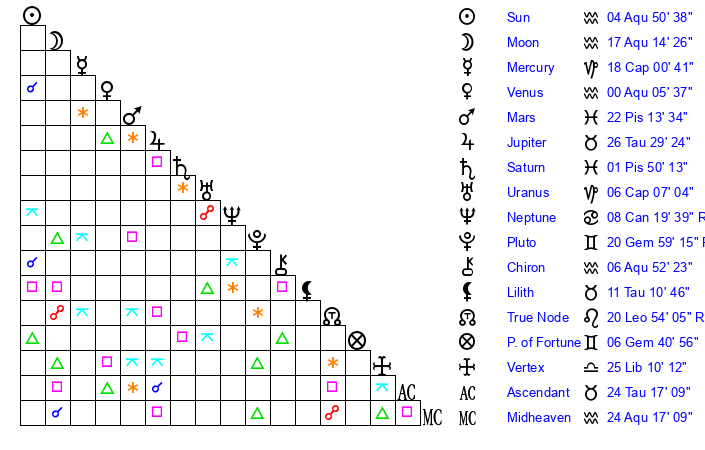 | Moon | 17 Aquarius 12 | 18 Sagittarius 48 | 17 Gemini 39 |