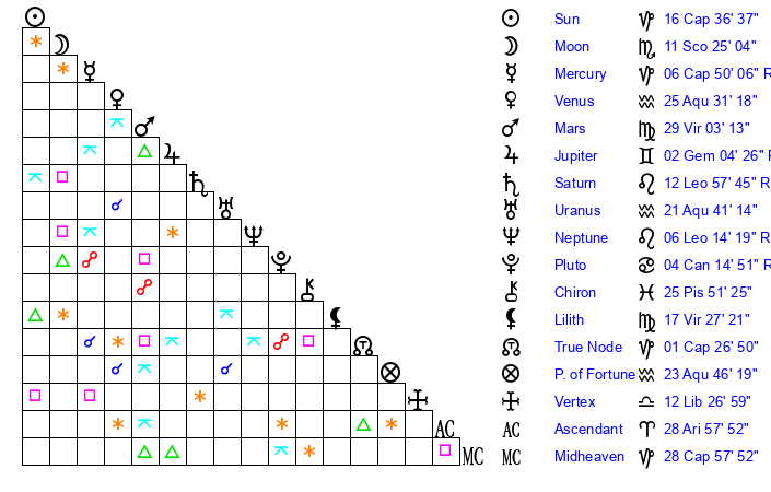 | Moon | 11 Scorpio 21 | 13 Virgo 17 | 27 Libra 42 |
