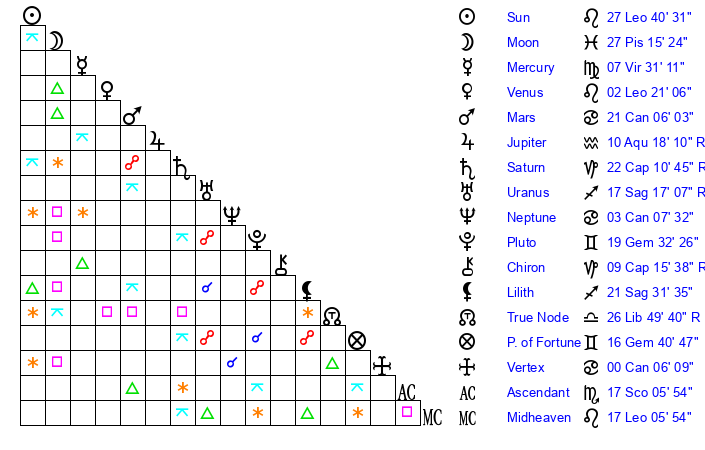 | Moon | 27 Pisces 18 | 9 Leo 47 | 10 Libra 18 |