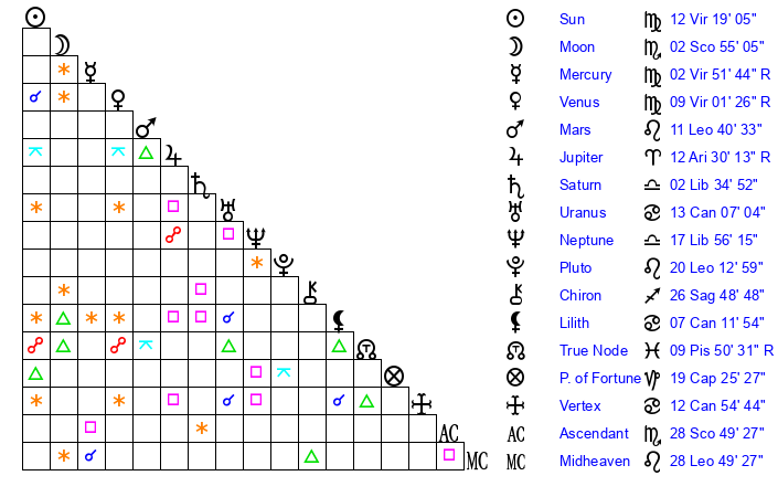 | Sun | 12 Virgo 19 | 13 Virgo 23 | 25 Scorpio 33 |