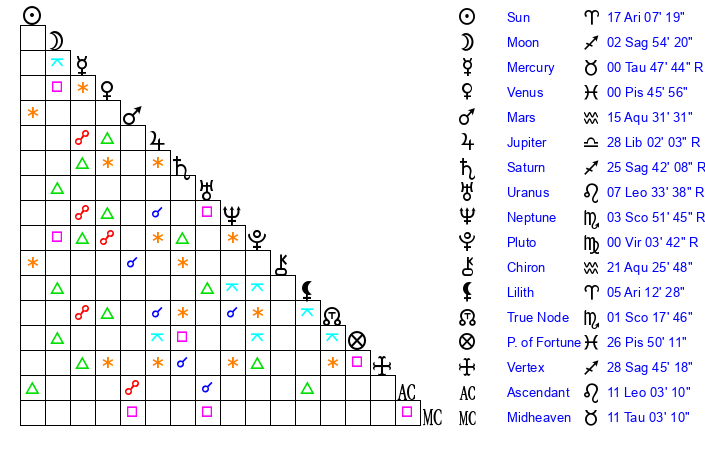 Venus | 0 Pisces 46 | 25 Pisces 16 | 14 Taurus 12 |