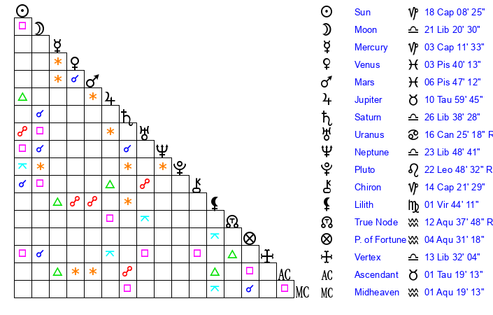 | Saturn | 27 Libra 8 | 15 Pisces 5 | 26 Libra 15 |