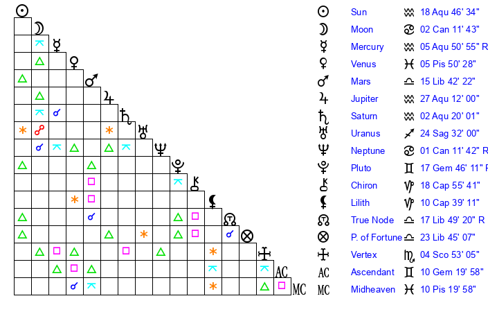 | Sun | 18 Aquarius 46 | 20 Aquarius 11 | 18 Gemini 37 |