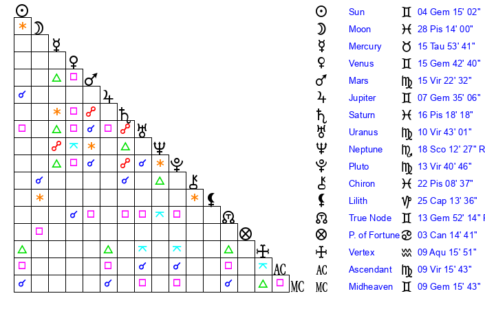 | Neptune | 18 Scorpio 12 | 1 Aries 44 | 17 Scorpio 14 |