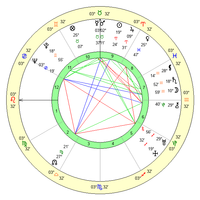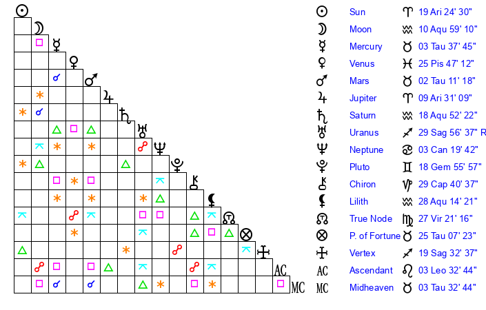 | Sun | 19 Aries 24 | 20 Aries 5 | 15 Leo 40 |
