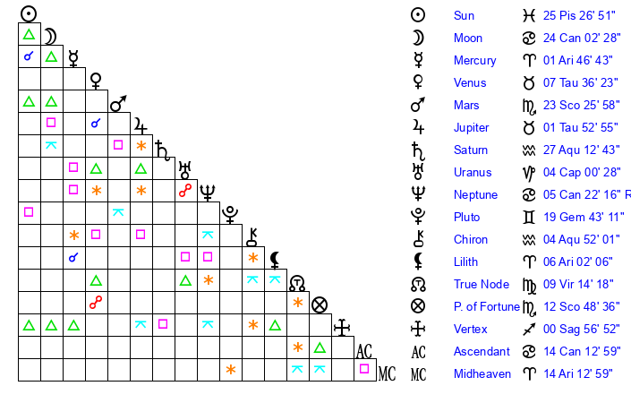 | Sun | 25 Pisces 27 | 26 Pisces 21 | 21 Cancer 32 |
