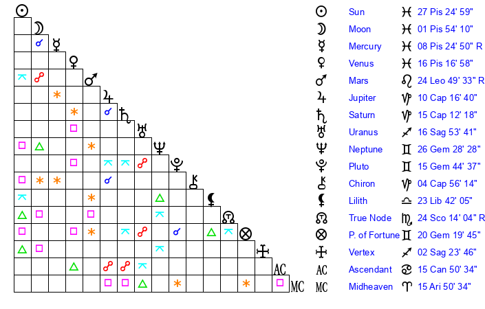 | Sun | 27 Pisces 24 | 28 Pisces 21 | 27 Cancer 14 |