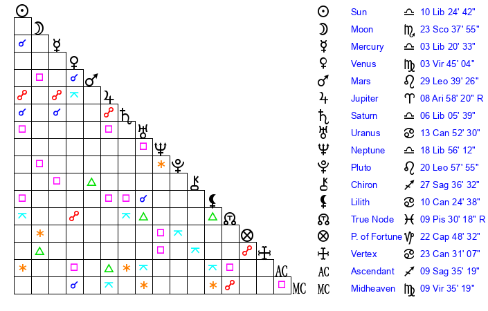 | Sun | 10 Libra 24 | 11 Libra 28 | 24 Sagittarius 42 |