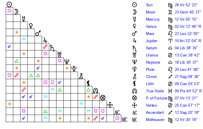 | Sun | 28 Virgo 52 | 29 Virgo 56 | 12 Sagittarius 45 |