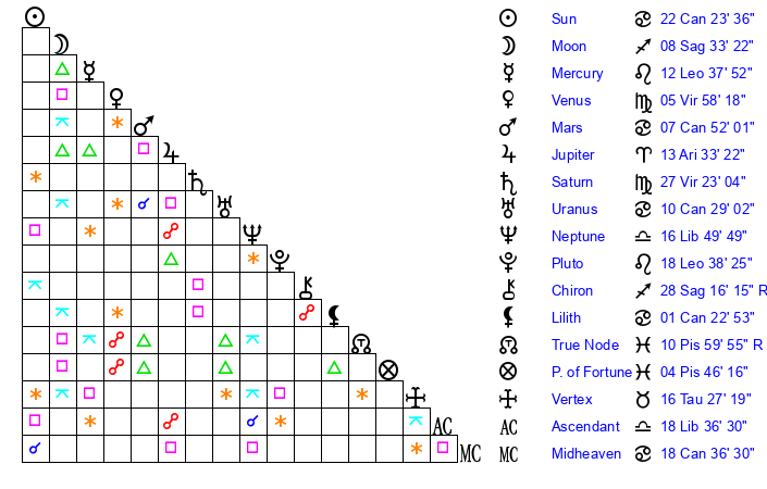 | Sun | 22 Cancer 23 | 23 Cancer 27 | 3 Libra 46 |