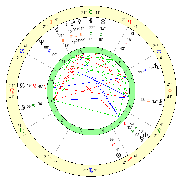| Moon | 5 Virgo 33 | 3 Leo 9 | 24 Capricorn 45 |