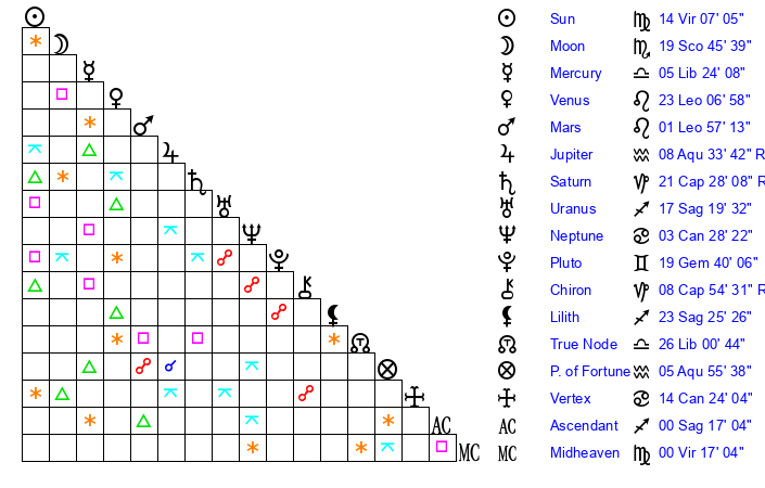 | Sun | 14 Virgo 7 | 15 Virgo 19 | 17 Capricorn 16 |