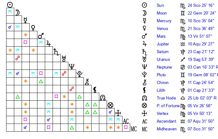 | Venus | 21 Scorpio 37 | 13 Scorpio 30 | 25 Aries 22 |